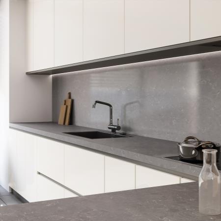SIMA este un model de quartz cu aspect usor marmorat care are suprafata cu un fond de culoare gri light, impregnata de o venatura subtila alb-gri. Produs din gama Premium, confera eleganta incaperilor in care este integrata.