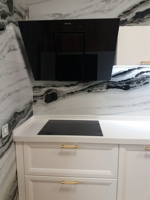 - In cazul in care optati pentru placarea peretelui cu placa de quartz, trebuie acordata o atentie deosebita pozitionarii plitei fata de perete, respectiv distantei care ramane intre marginea plitei si placa de perete. Aceasta trebuie sa fie de min 5-7 cm, in cazul in care plita are ‘ochiul mare’ pozitionat spre perete. In caz contrar, placa de perete poate fi deteriorata in timp de caldura/flacarile emanate de la ochiul mare al plitei. Ca atare, trebuie avut in vedere acest aspect impreuna cu proiectantul mobilierului care trebuie sa se asigure ca montajul mobilierului sa permita a adancime/latime a blatului majorata (min 65 cm). Nu ne asumam raspunderea deteriorarii placii de perete fabricata din quartz, in acest caz.