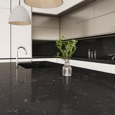 SADIRA este un model de quartz cu aspect marmorat, care are suprafata cu un fond de culoare neagra, cu o venatura discreta alb-gri . Produs din gama Premium, se preteaza unor ambiente elegante si sofisticate.