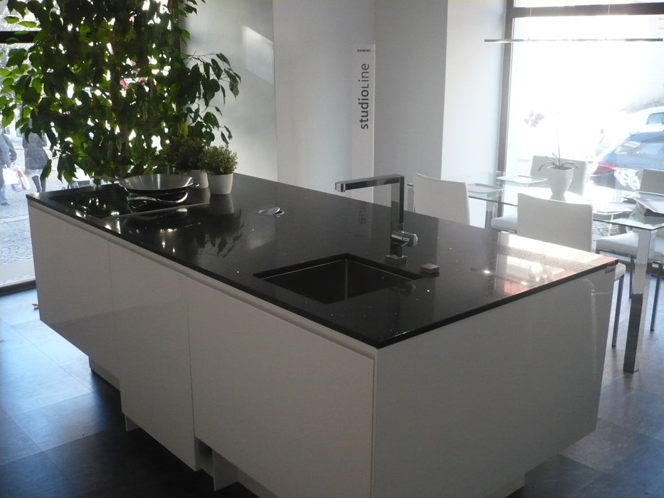 Brilliant Black este un quartz compozit de culoare neagră, cu o ușoară pigmentare și inserții discrete de oglindă. Fabricat de Technistone, acest material transformă orice baie într-un spațiu rafinat și elegant, fiind ușor de integrat în orice stil de mobilier.