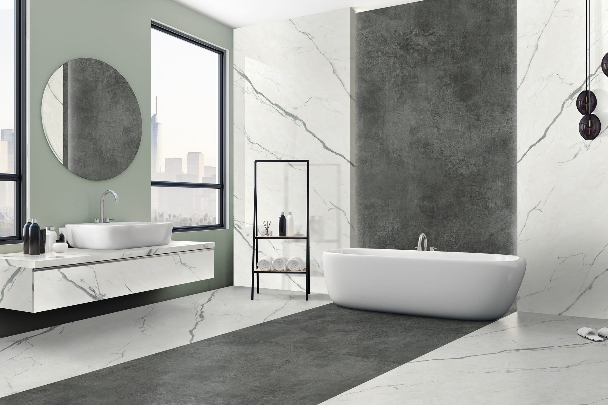 Meraki este o ceramică portelanată premium, cu un aspect elegant de marmură, având o suprafață albă cu venaturi gri-ciment. Disponibilă în finisaje lucios și mat, este ideală pentru blaturi de baie, băi și alte aplicații rezistente și estetice.